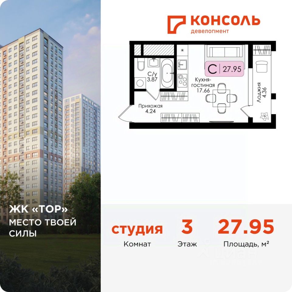 Продается квартира-студия 13 без отделки в ЖК ''ТОР'' площадью 27.95 на 3 этаже от застройщика Консоль девелопмент. Жилому комплексу ТОР присвоен повышенный уровень комфортности — комфорт плюс. Он подразумевает светлые просторные квартиры с большими окнами и удобной планировкой, оригинальные парадные и общественные пространства.