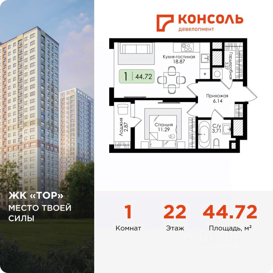 Продается однокомнатная квартира 209 без отделки в ЖК ''ТОР'' площадью 44.72 на 22 этаже от застройщика Консоль девелопмент. Жилому комплексу ТОР присвоен повышенный уровень комфортности — комфорт плюс. Он подразумевает светлые просторные квартиры с большими окнами и удобной планировкой, оригинальные парадные и общественные пространства.