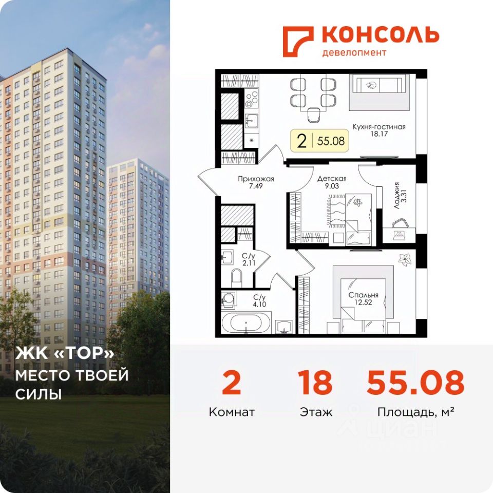 Продается двухкомнатная квартира 203 без отделки в ЖК ''ТОР'' площадью 55.08 на 18 этаже от застройщика Консоль девелопмент. Жилому комплексу ТОР присвоен повышенный уровень комфортности — комфорт плюс. Он подразумевает светлые просторные квартиры с большими окнами и удобной планировкой, оригинальные парадные и общественные пространства.