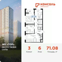 Продается трехкомнатная квартира 57 без отделки в ЖК ''ТОР'' площадью 71.08 на 6 этаже от застройщика Консоль девелопмент.Жилому комплексу ТОР присвоен повышенный уровень комфортности — комфорт плюс. Он подразумевает светлые просторные квартиры с большими окнами и удобной планировкой, оригинальные парадные и общественные пространства.