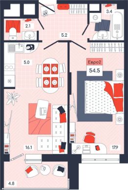 Продаётся 2-комнатная квартира в строящемся доме (Дом 20), срок сдачи: I-кв. 2026, общей площадью 54.5 кв.м., на 13 этаже. Расположение, транспортная доступность Новый жилой комплекс ''Юго-Восточный'' строится в Туле, в 3,5 км от центра города. Благодаря удачным транспортным развязкам, автолюбители смогут доехать до центральных кварталов примерно за 5 10 минут, составив наиболее быстрый и удобный маршрут с учетом загруженности дорог. Проблем с мобильностью не возникнет и у пассажиров общественного транспорта. Рядом с домом расположены остановки автобусов и маршрутных такси, которые быстро довезут до любого района города. Так, чтобы добраться до центра, следует дойти пешком до остановки ''Медтехника'', где останавливается маршрутное такси, доезжающее до центральных кварталов всего за 7 8 минут. Инфраструктура Район, где возводится новый жилой комплекс, активно застраивается, и сеть инфраструктуры сов временем будет расширяться. Но и сейчас все, что нужно для комфортной жизни в городе, находится недалеко от жилого комплекса. В шаговой доступности расположены продуктовые магазины: ''Виктория'', ''Овощи-фрукты'', Магазин рыбы и мяса птицы, магазин мяса и колбас ''У Максима'', супермаркеты ''Дикси'', ''Пятерочка'', ''SPAR''. Неподалеку находится гипермаркет ''Линия'', крупный торговый центр, в котором расположены отделения банков, гипермаркет ''Глобус'', салон оптики, мебельный магазин ''Столплит'', зоомагазин ''Четыре лапы'' и пр. В соседнем здании находится строительный гипермаркет ''Леруа Мерлен'', за ним крупный магазин товаров для спорта, туризма и активного отдыха ''Декатлон''.Недалеко от жилого комплекса открыты кафе и рестораны: кофейня ''Bonape'', пиццерия ''Культура'', кафе ''Вкуснов'', кафе быстрого обслуживания ''Rapido'', ресторан ''У фонтана'' и пр.В районе есть аптеки, поликлиники, диагностические центры. В шаговой доступности от жилого комплекса расположено несколько детских садиков, в том числе, садик комбинированного вида ''Алые паруса''. Есть дошкольные отделения, входящие в состав образовательных центров, Центры развития ребенка. Поблизости расположены средние школы, в том числе, школа для детей с ОВЗ. Рядом с жилым комплексом находится Тульская Духовная Семинария и Суворовское училище. Надежность застройщик: достраивает объект ООО Ин-Групп.АрхитектураЖилой комплекс будет представлен 19 монолитно-кирпичными корпусами переменной этажности, выполненными в едином архитектурном стиле. При строительстве ЖК ''Юго-Восточный'' применяются современные материалы высокого качества, которые обеспечивают надежность домов и комфортный микроклимат в помещениях. Каждая секция оснащается современными лифтами. Помещения общего пользования отделываются экологичными материалами. Квартиры предлагаются однокомнатные (от 43,9 кв. м), двухкомнатные (от 45,8 кв. м), трехкомнатные (от 60,4 кв. м) и четырехкомнатные (от 87,2 кв. м), а также уютные студии (от 28,9 кв. м).На внутренней территории проводится комплексное благоустройство: озеленение, организация игровых площадок, мест для отдыха и зан