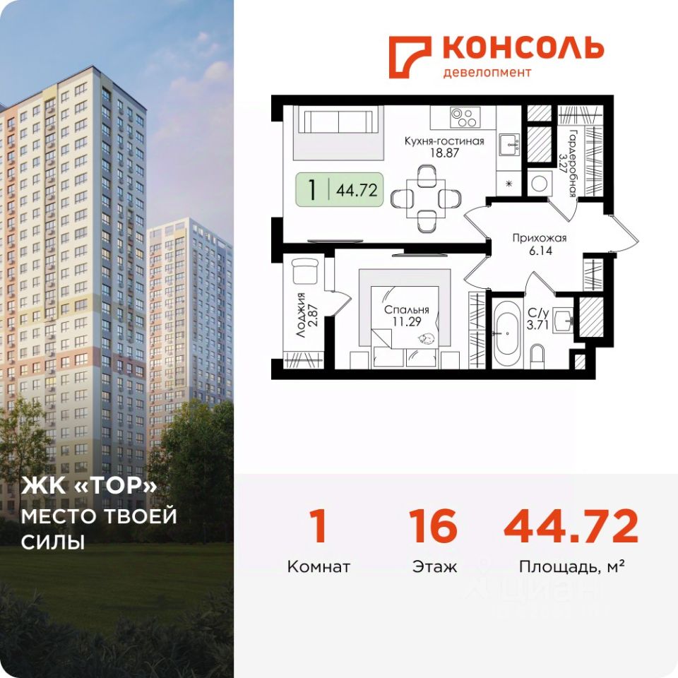 Продается однокомнатная квартира 149 с чистовой отделкой в ЖК ''ТОР'' площадью 44.72 на 16 этаже от застройщика Консоль девелопмент. Жилому комплексу ТОР присвоен повышенный уровень комфортности — комфорт плюс. Он подразумевает светлые просторные квартиры с большими окнами и удобной планировкой, оригинальные парадные и общественные пространства.