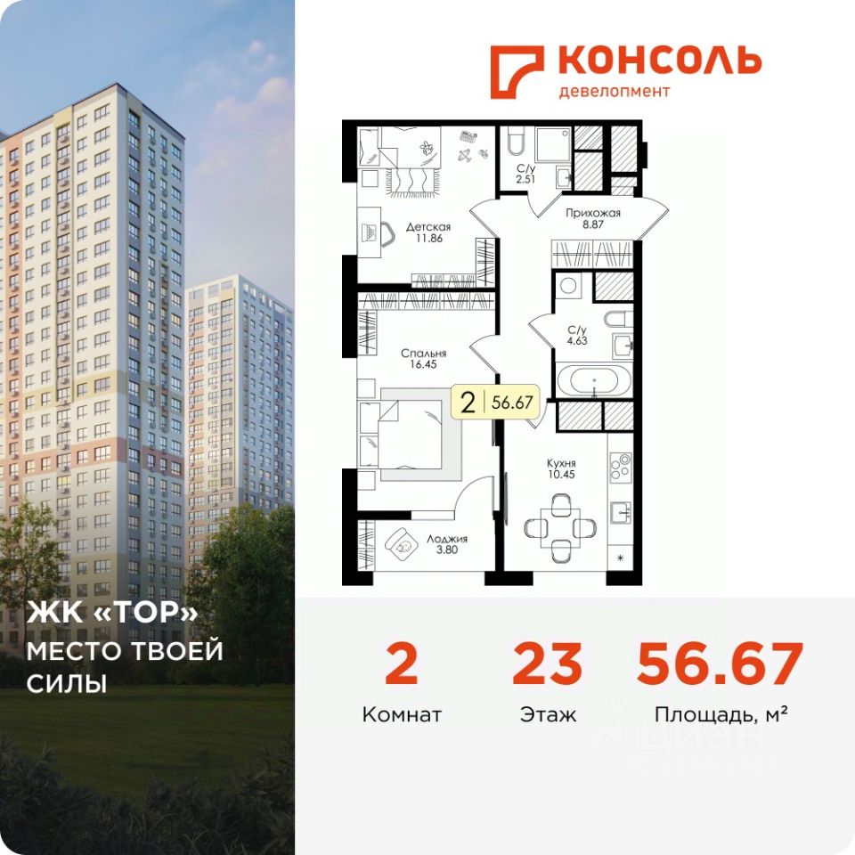 Продается двухкомнатная квартира 256 без отделки в ЖК ''ТОР'' площадью 56.67 на 23 этаже от застройщика Консоль девелопмент. Жилому комплексу ТОР присвоен повышенный уровень комфортности — комфорт плюс. Он подразумевает светлые просторные квартиры с большими окнами и удобной планировкой, оригинальные парадные и общественные пространства.