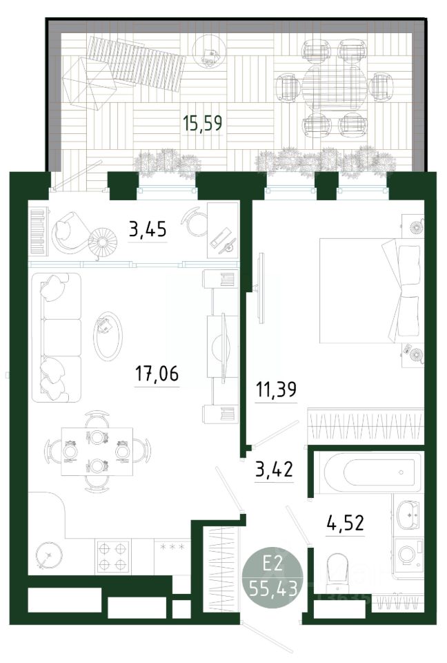 Общая площадь55,43 м2