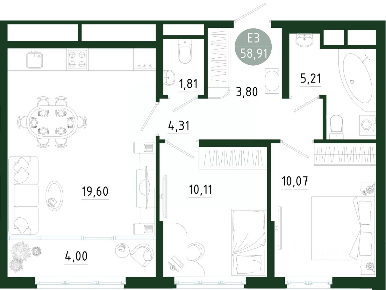 Общая площадь58,91 м2
