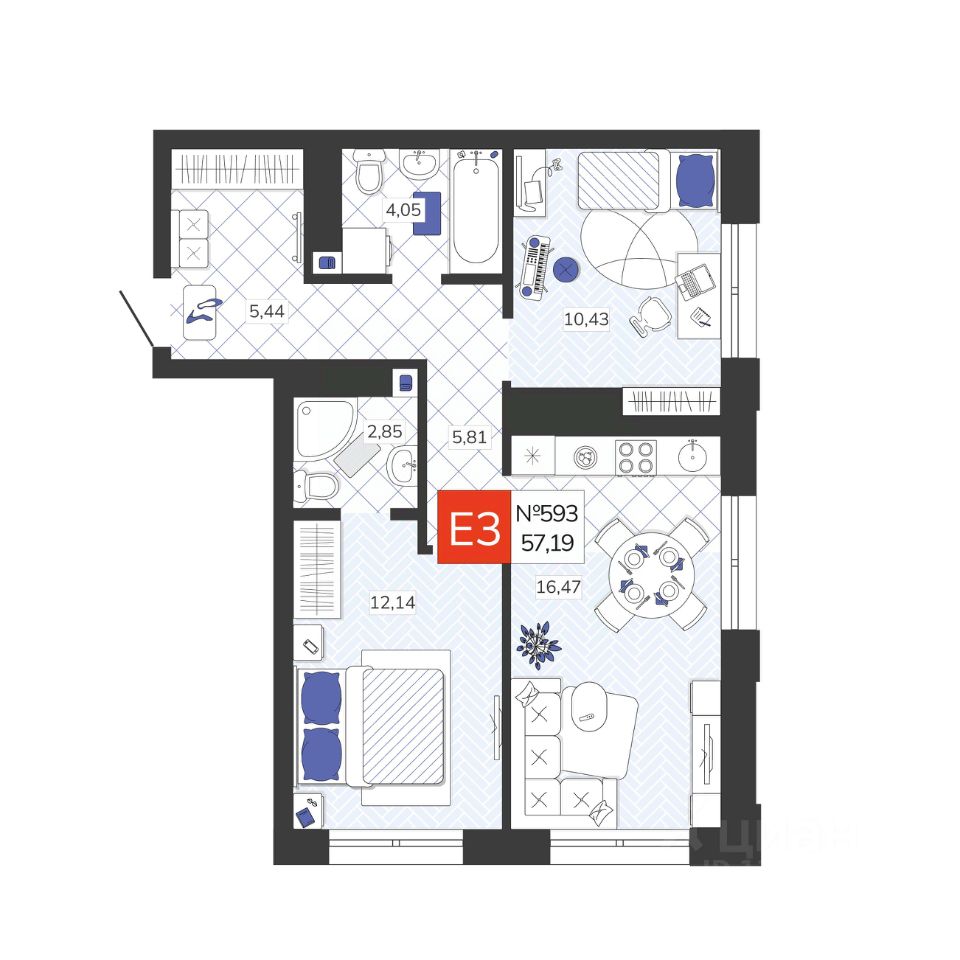 Общая площадь57,19 м2