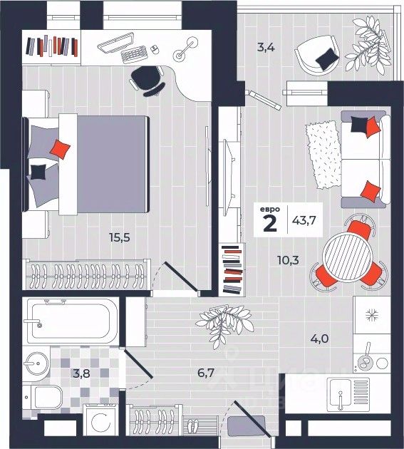 Продаётся 2-комнатная квартира в строящемся доме (Дом 30), срок сдачи: IV-кв. 2026, общей площадью 43.7 кв.м., на 3 этаже. Расположение, транспортная доступность Новый жилой комплекс ''Юго-Восточный'' строится в Туле, в 3,5 км от центра города. Благодаря удачным транспортным развязкам, автолюбители смогут доехать до центральных кварталов примерно за 5 10 минут, составив наиболее быстрый и удобный маршрут с учетом загруженности дорог. Проблем с мобильностью не возникнет и у пассажиров общественного транспорта. Рядом с домом расположены остановки автобусов и маршрутных такси, которые быстро довезут до любого района города. Так, чтобы добраться до центра, следует дойти пешком до остановки ''Медтехника'', где останавливается маршрутное такси, доезжающее до центральных кварталов всего за 7 8 минут. Инфраструктура Район, где возводится новый жилой комплекс, активно застраивается, и сеть инфраструктуры сов временем будет расширяться. Но и сейчас все, что нужно для комфортной жизни в городе, находится недалеко от жилого комплекса. В шаговой доступности расположены продуктовые магазины: ''Виктория'', ''Овощи-фрукты'', Магазин рыбы и мяса птицы, магазин мяса и колбас ''У Максима'', супермаркеты ''Дикси'', ''Пятерочка'', ''SPAR''. Неподалеку находится гипермаркет ''Линия'', крупный торговый центр, в котором расположены отделения банков, гипермаркет ''Глобус'', салон оптики, мебельный магазин ''Столплит'', зоомагазин ''Четыре лапы'' и пр. В соседнем здании находится строительный гипермаркет ''Леруа Мерлен'', за ним крупный магазин товаров для спорта, туризма и активного отдыха ''Декатлон''.Недалеко от жилого комплекса открыты кафе и рестораны: кофейня ''Bonape'', пиццерия ''Культура'', кафе ''Вкуснов'', кафе быстрого обслуживания ''Rapido'', ресторан ''У фонтана'' и пр.В районе есть аптеки, поликлиники, диагностические центры. В шаговой доступности от жилого комплекса расположено несколько детских садиков, в том числе, садик комбинированного вида ''Алые паруса''. Есть дошкольные отделения, входящие в состав образовательных центров, Центры развития ребенка. Поблизости расположены средние школы, в том числе, школа для детей с ОВЗ. Рядом с жилым комплексом находится Тульская Духовная Семинария и Суворовское училище. Надежность застройщик: достраивает объект ООО Ин-Групп.АрхитектураЖилой комплекс будет представлен 19 монолитно-кирпичными корпусами переменной этажности, выполненными в едином архитектурном стиле. При строительстве ЖК ''Юго-Восточный'' применяются современные материалы высокого качества, которые обеспечивают надежность домов и комфортный микроклимат в помещениях. Каждая секция оснащается современными лифтами. Помещения общего пользования отделываются экологичными материалами. Квартиры предлагаются однокомнатные (от 43,9 кв. м), двухкомнатные (от 45,8 кв. м), трехкомнатные (от 60,4 кв. м) и четырехкомнатные (от 87,2 кв. м), а также уютные студии (от 28,9 кв. м).На внутренней территории проводится комплексное благоустройство: озеленение, организация игровых площадок, мест для отдыха и зан