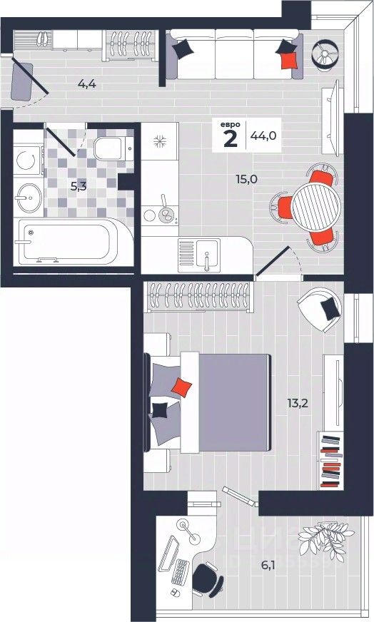 Продаётся 2-комнатная квартира в строящемся доме (Дом 30), срок сдачи: IV-кв. 2026, общей площадью 44 кв.м., на 2 этаже. Расположение, транспортная доступность Новый жилой комплекс ''Юго-Восточный'' строится в Туле, в 3,5 км от центра города. Благодаря удачным транспортным развязкам, автолюбители смогут доехать до центральных кварталов примерно за 5 10 минут, составив наиболее быстрый и удобный маршрут с учетом загруженности дорог. Проблем с мобильностью не возникнет и у пассажиров общественного транспорта. Рядом с домом расположены остановки автобусов и маршрутных такси, которые быстро довезут до любого района города. Так, чтобы добраться до центра, следует дойти пешком до остановки ''Медтехника'', где останавливается маршрутное такси, доезжающее до центральных кварталов всего за 7 8 минут. Инфраструктура Район, где возводится новый жилой комплекс, активно застраивается, и сеть инфраструктуры сов временем будет расширяться. Но и сейчас все, что нужно для комфортной жизни в городе, находится недалеко от жилого комплекса. В шаговой доступности расположены продуктовые магазины: ''Виктория'', ''Овощи-фрукты'', Магазин рыбы и мяса птицы, магазин мяса и колбас ''У Максима'', супермаркеты ''Дикси'', ''Пятерочка'', ''SPAR''. Неподалеку находится гипермаркет ''Линия'', крупный торговый центр, в котором расположены отделения банков, гипермаркет ''Глобус'', салон оптики, мебельный магазин ''Столплит'', зоомагазин ''Четыре лапы'' и пр. В соседнем здании находится строительный гипермаркет ''Леруа Мерлен'', за ним крупный магазин товаров для спорта, туризма и активного отдыха ''Декатлон''.Недалеко от жилого комплекса открыты кафе и рестораны: кофейня ''Bonape'', пиццерия ''Культура'', кафе ''Вкуснов'', кафе быстрого обслуживания ''Rapido'', ресторан ''У фонтана'' и пр.В районе есть аптеки, поликлиники, диагностические центры. В шаговой доступности от жилого комплекса расположено несколько детских садиков, в том числе, садик комбинированного вида ''Алые паруса''. Есть дошкольные отделения, входящие в состав образовательных центров, Центры развития ребенка. Поблизости расположены средние школы, в том числе, школа для детей с ОВЗ. Рядом с жилым комплексом находится Тульская Духовная Семинария и Суворовское училище. Надежность застройщик: достраивает объект ООО Ин-Групп.АрхитектураЖилой комплекс будет представлен 19 монолитно-кирпичными корпусами переменной этажности, выполненными в едином архитектурном стиле. При строительстве ЖК ''Юго-Восточный'' применяются современные материалы высокого качества, которые обеспечивают надежность домов и комфортный микроклимат в помещениях. Каждая секция оснащается современными лифтами. Помещения общего пользования отделываются экологичными материалами. Квартиры предлагаются однокомнатные (от 43,9 кв. м), двухкомнатные (от 45,8 кв. м), трехкомнатные (от 60,4 кв. м) и четырехкомнатные (от 87,2 кв. м), а также уютные студии (от 28,9 кв. м).На внутренней территории проводится комплексное благоустройство: озеленение, организация игровых площадок, мест для отдыха и занят