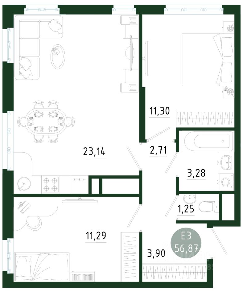 Общая площадь56,87 м2