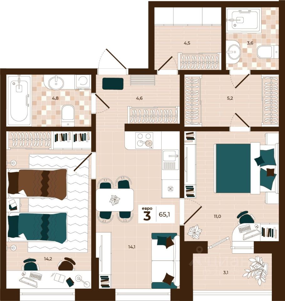 Продаётся 3-комнатная квартира в строящемся доме (Дом 28), срок сдачи: I-кв. 2027, общей площадью 65.1 кв.м., на 9 этаже. Расположение, транспортная доступность Новый жилой комплекс ''Юго-Восточный'' строится в Туле, в 3,5 км от центра города. Благодаря удачным транспортным развязкам, автолюбители смогут доехать до центральных кварталов примерно за 5 10 минут, составив наиболее быстрый и удобный маршрут с учетом загруженности дорог. Проблем с мобильностью не возникнет и у пассажиров общественного транспорта. Рядом с домом расположены остановки автобусов и маршрутных такси, которые быстро довезут до любого района города. Так, чтобы добраться до центра, следует дойти пешком до остановки ''Медтехника'', где останавливается маршрутное такси, доезжающее до центральных кварталов всего за 7 8 минут. Инфраструктура Район, где возводится новый жилой комплекс, активно застраивается, и сеть инфраструктуры сов временем будет расширяться. Но и сейчас все, что нужно для комфортной жизни в городе, находится недалеко от жилого комплекса. В шаговой доступности расположены продуктовые магазины: ''Виктория'', ''Овощи-фрукты'', Магазин рыбы и мяса птицы, магазин мяса и колбас ''У Максима'', супермаркеты ''Дикси'', ''Пятерочка'', ''SPAR''. Неподалеку находится гипермаркет ''Линия'', крупный торговый центр, в котором расположены отделения банков, гипермаркет ''Глобус'', салон оптики, мебельный магазин ''Столплит'', зоомагазин ''Четыре лапы'' и пр. В соседнем здании находится строительный гипермаркет ''Леруа Мерлен'', за ним крупный магазин товаров для спорта, туризма и активного отдыха ''Декатлон''.Недалеко от жилого комплекса открыты кафе и рестораны: кофейня ''Bonape'', пиццерия ''Культура'', кафе ''Вкуснов'', кафе быстрого обслуживания ''Rapido'', ресторан ''У фонтана'' и пр.В районе есть аптеки, поликлиники, диагностические центры. В шаговой доступности от жилого комплекса расположено несколько детских садиков, в том числе, садик комбинированного вида ''Алые паруса''. Есть дошкольные отделения, входящие в состав образовательных центров, Центры развития ребенка. Поблизости расположены средние школы, в том числе, школа для детей с ОВЗ. Рядом с жилым комплексом находится Тульская Духовная Семинария и Суворовское училище. Надежность застройщик: достраивает объект ООО Ин-Групп.АрхитектураЖилой комплекс будет представлен 19 монолитно-кирпичными корпусами переменной этажности, выполненными в едином архитектурном стиле. При строительстве ЖК ''Юго-Восточный'' применяются современные материалы высокого качества, которые обеспечивают надежность домов и комфортный микроклимат в помещениях. Каждая секция оснащается современными лифтами. Помещения общего пользования отделываются экологичными материалами. Квартиры предлагаются однокомнатные (от 43,9 кв. м), двухкомнатные (от 45,8 кв. м), трехкомнатные (от 60,4 кв. м) и четырехкомнатные (от 87,2 кв. м), а также уютные студии (от 28,9 кв. м).На внутренней территории проводится комплексное благоустройство: озеленение, организация игровых площадок, мест для отдыха и заня