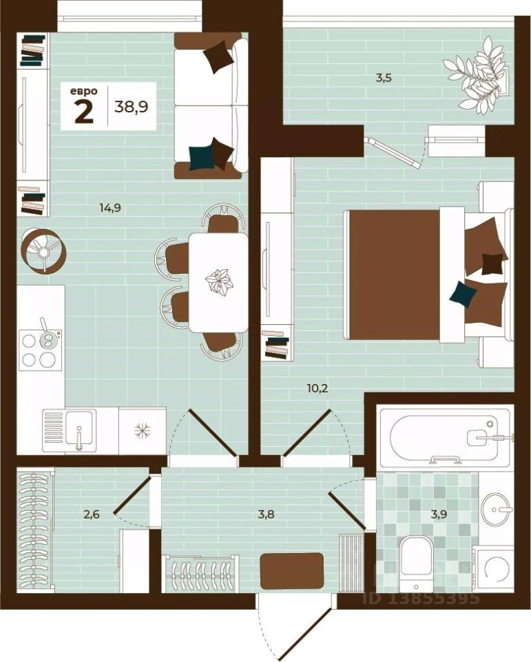 Продаётся 2-комнатная квартира в строящемся доме (Дом 28), срок сдачи: I-кв. 2027, общей площадью 38.9 кв.м., на 13 этаже. Расположение, транспортная доступность Новый жилой комплекс ''Юго-Восточный'' строится в Туле, в 3,5 км от центра города. Благодаря удачным транспортным развязкам, автолюбители смогут доехать до центральных кварталов примерно за 5 10 минут, составив наиболее быстрый и удобный маршрут с учетом загруженности дорог. Проблем с мобильностью не возникнет и у пассажиров общественного транспорта. Рядом с домом расположены остановки автобусов и маршрутных такси, которые быстро довезут до любого района города. Так, чтобы добраться до центра, следует дойти пешком до остановки ''Медтехника'', где останавливается маршрутное такси, доезжающее до центральных кварталов всего за 7 8 минут. Инфраструктура Район, где возводится новый жилой комплекс, активно застраивается, и сеть инфраструктуры сов временем будет расширяться. Но и сейчас все, что нужно для комфортной жизни в городе, находится недалеко от жилого комплекса. В шаговой доступности расположены продуктовые магазины: ''Виктория'', ''Овощи-фрукты'', Магазин рыбы и мяса птицы, магазин мяса и колбас ''У Максима'', супермаркеты ''Дикси'', ''Пятерочка'', ''SPAR''. Неподалеку находится гипермаркет ''Линия'', крупный торговый центр, в котором расположены отделения банков, гипермаркет ''Глобус'', салон оптики, мебельный магазин ''Столплит'', зоомагазин ''Четыре лапы'' и пр. В соседнем здании находится строительный гипермаркет ''Леруа Мерлен'', за ним крупный магазин товаров для спорта, туризма и активного отдыха ''Декатлон''.Недалеко от жилого комплекса открыты кафе и рестораны: кофейня ''Bonape'', пиццерия ''Культура'', кафе ''Вкуснов'', кафе быстрого обслуживания ''Rapido'', ресторан ''У фонтана'' и пр.В районе есть аптеки, поликлиники, диагностические центры. В шаговой доступности от жилого комплекса расположено несколько детских садиков, в том числе, садик комбинированного вида ''Алые паруса''. Есть дошкольные отделения, входящие в состав образовательных центров, Центры развития ребенка. Поблизости расположены средние школы, в том числе, школа для детей с ОВЗ. Рядом с жилым комплексом находится Тульская Духовная Семинария и Суворовское училище. Надежность застройщик: достраивает объект ООО Ин-Групп.АрхитектураЖилой комплекс будет представлен 19 монолитно-кирпичными корпусами переменной этажности, выполненными в едином архитектурном стиле. При строительстве ЖК ''Юго-Восточный'' применяются современные материалы высокого качества, которые обеспечивают надежность домов и комфортный микроклимат в помещениях. Каждая секция оснащается современными лифтами. Помещения общего пользования отделываются экологичными материалами. Квартиры предлагаются однокомнатные (от 43,9 кв. м), двухкомнатные (от 45,8 кв. м), трехкомнатные (от 60,4 кв. м) и четырехкомнатные (от 87,2 кв. м), а также уютные студии (от 28,9 кв. м).На внутренней территории проводится комплексное благоустройство: озеленение, организация игровых площадок, мест для отдыха и зан