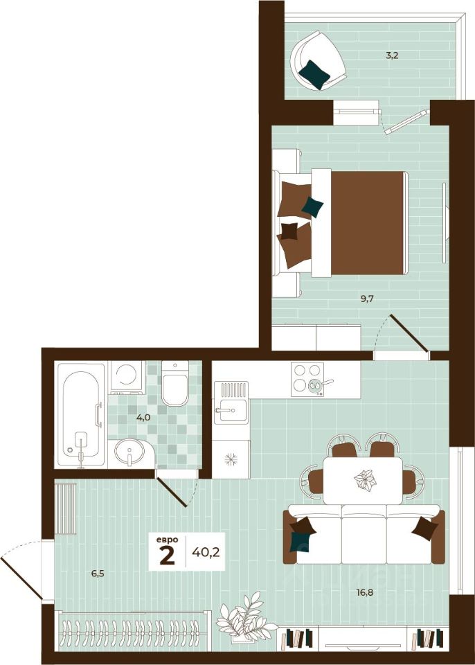 Продаётся 2-комнатная квартира в строящемся доме (Дом 28), срок сдачи: I-кв. 2027, общей площадью 40.2 кв.м., на 6 этаже. Расположение, транспортная доступность Новый жилой комплекс ''Юго-Восточный'' строится в Туле, в 3,5 км от центра города. Благодаря удачным транспортным развязкам, автолюбители смогут доехать до центральных кварталов примерно за 5 10 минут, составив наиболее быстрый и удобный маршрут с учетом загруженности дорог. Проблем с мобильностью не возникнет и у пассажиров общественного транспорта. Рядом с домом расположены остановки автобусов и маршрутных такси, которые быстро довезут до любого района города. Так, чтобы добраться до центра, следует дойти пешком до остановки ''Медтехника'', где останавливается маршрутное такси, доезжающее до центральных кварталов всего за 7 8 минут. Инфраструктура Район, где возводится новый жилой комплекс, активно застраивается, и сеть инфраструктуры сов временем будет расширяться. Но и сейчас все, что нужно для комфортной жизни в городе, находится недалеко от жилого комплекса. В шаговой доступности расположены продуктовые магазины: ''Виктория'', ''Овощи-фрукты'', Магазин рыбы и мяса птицы, магазин мяса и колбас ''У Максима'', супермаркеты ''Дикси'', ''Пятерочка'', ''SPAR''. Неподалеку находится гипермаркет ''Линия'', крупный торговый центр, в котором расположены отделения банков, гипермаркет ''Глобус'', салон оптики, мебельный магазин ''Столплит'', зоомагазин ''Четыре лапы'' и пр. В соседнем здании находится строительный гипермаркет ''Леруа Мерлен'', за ним крупный магазин товаров для спорта, туризма и активного отдыха ''Декатлон''.Недалеко от жилого комплекса открыты кафе и рестораны: кофейня ''Bonape'', пиццерия ''Культура'', кафе ''Вкуснов'', кафе быстрого обслуживания ''Rapido'', ресторан ''У фонтана'' и пр.В районе есть аптеки, поликлиники, диагностические центры. В шаговой доступности от жилого комплекса расположено несколько детских садиков, в том числе, садик комбинированного вида ''Алые паруса''. Есть дошкольные отделения, входящие в состав образовательных центров, Центры развития ребенка. Поблизости расположены средние школы, в том числе, школа для детей с ОВЗ. Рядом с жилым комплексом находится Тульская Духовная Семинария и Суворовское училище. Надежность застройщик: достраивает объект ООО Ин-Групп.АрхитектураЖилой комплекс будет представлен 19 монолитно-кирпичными корпусами переменной этажности, выполненными в едином архитектурном стиле. При строительстве ЖК ''Юго-Восточный'' применяются современные материалы высокого качества, которые обеспечивают надежность домов и комфортный микроклимат в помещениях. Каждая секция оснащается современными лифтами. Помещения общего пользования отделываются экологичными материалами. Квартиры предлагаются однокомнатные (от 43,9 кв. м), двухкомнатные (от 45,8 кв. м), трехкомнатные (от 60,4 кв. м) и четырехкомнатные (от 87,2 кв. м), а также уютные студии (от 28,9 кв. м).На внутренней территории проводится комплексное благоустройство: озеленение, организация игровых площадок, мест для отдыха и заня