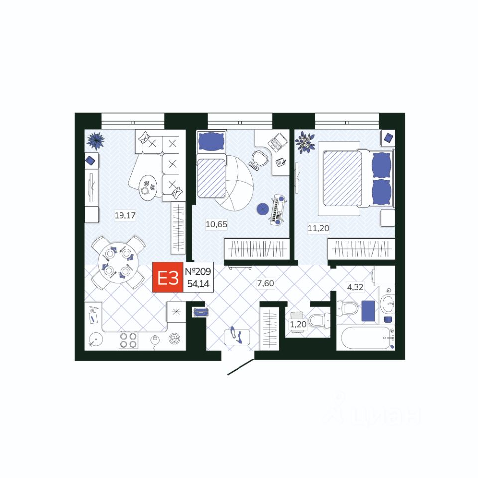 Общая площадь54,14 м2