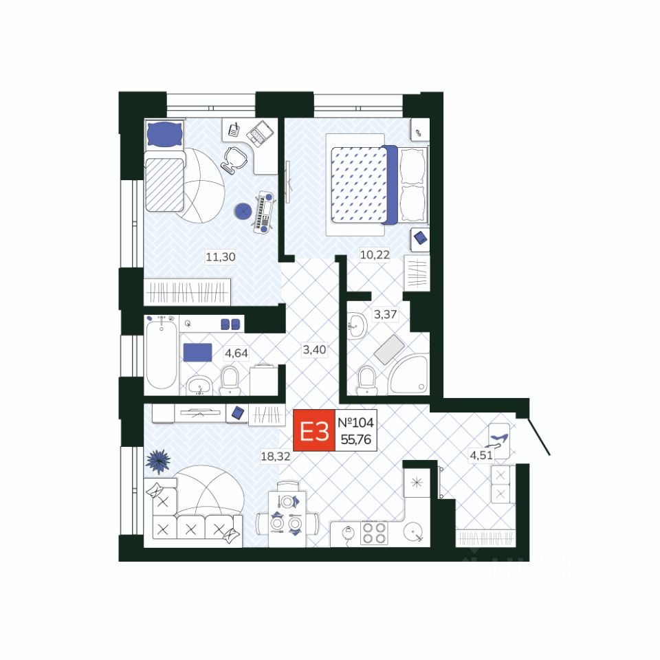 Общая площадь55,76 м2