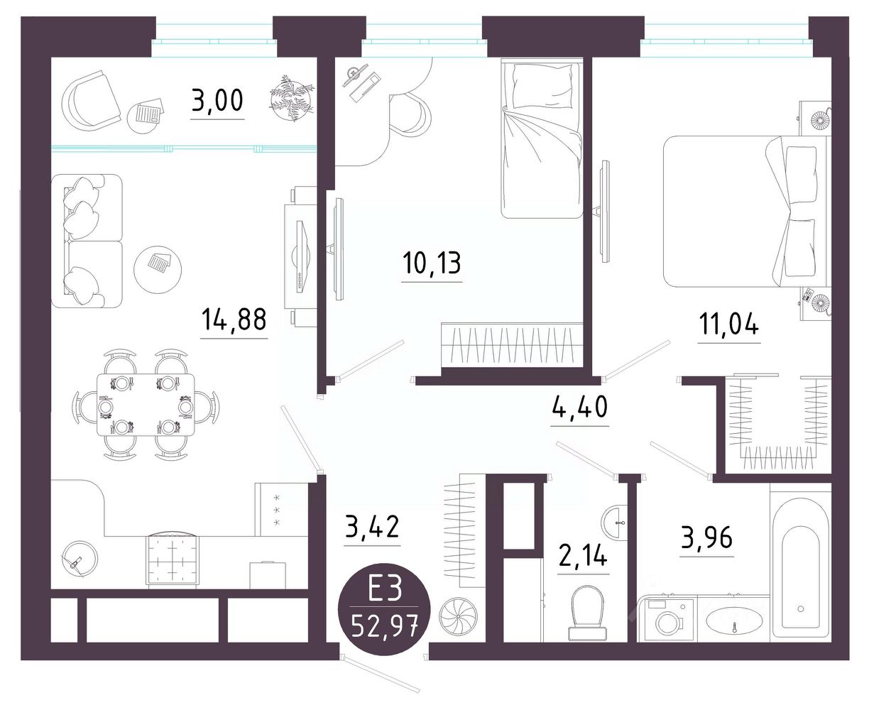 Общая площадь52,97 м2