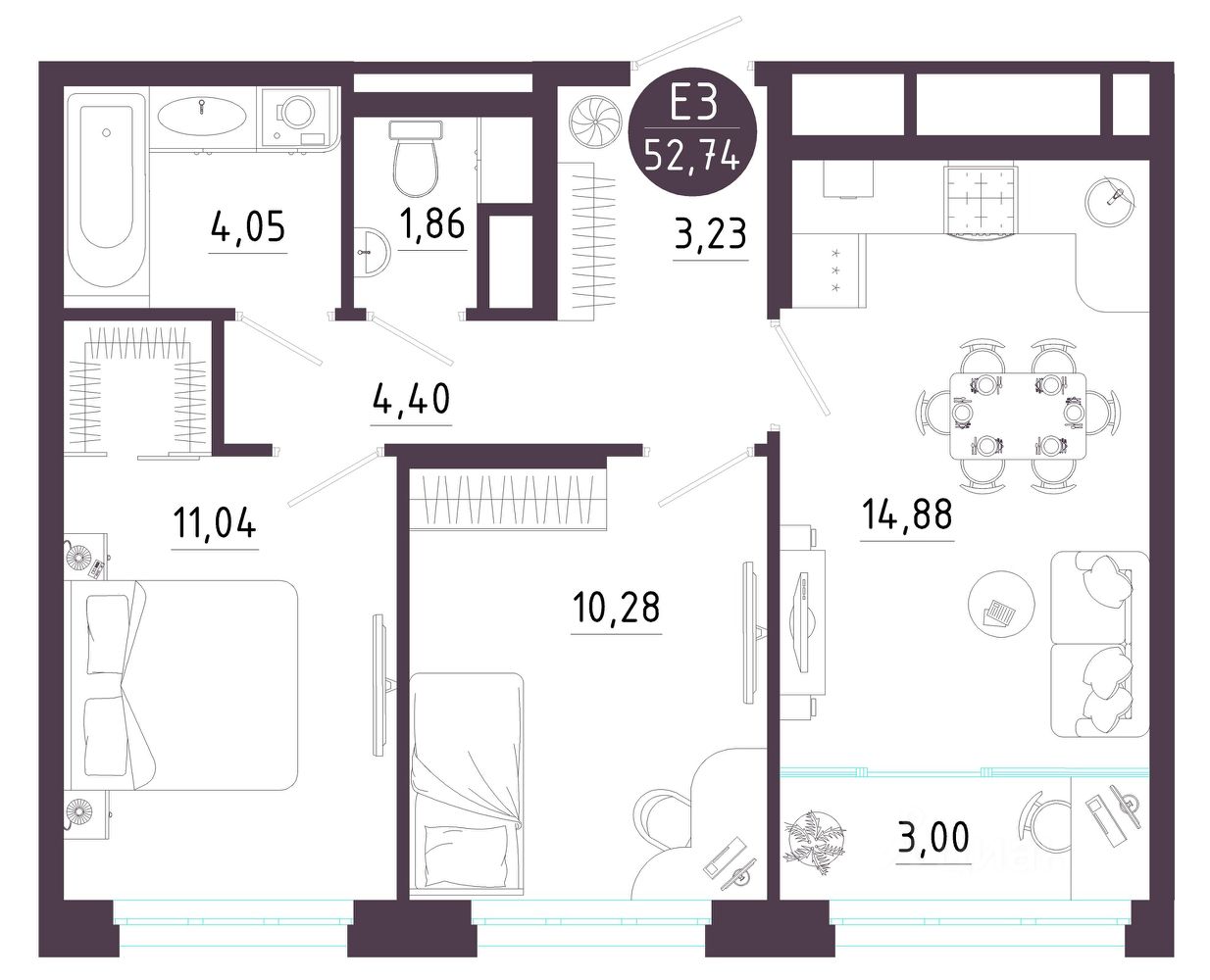 Общая площадь52,74 м2