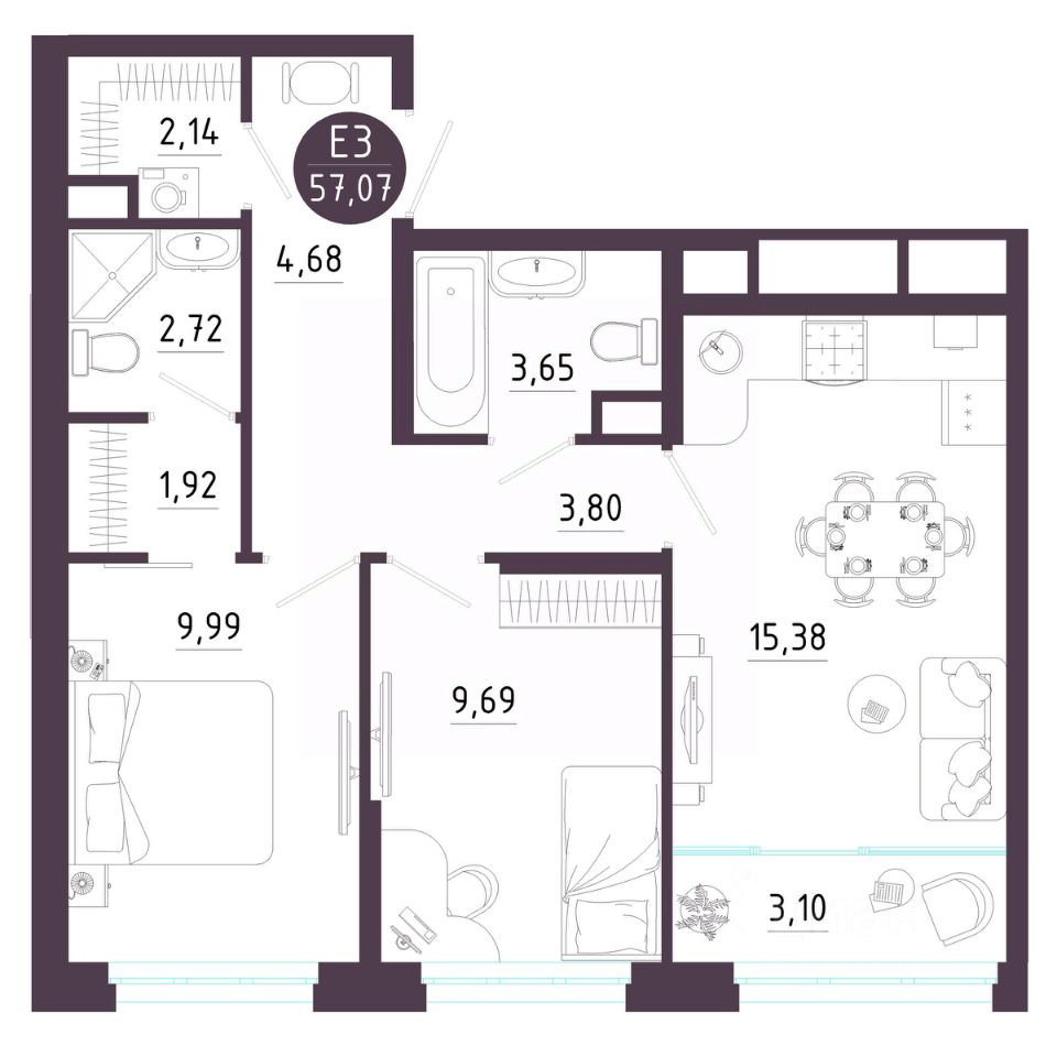 Общая площадь57,07 м2