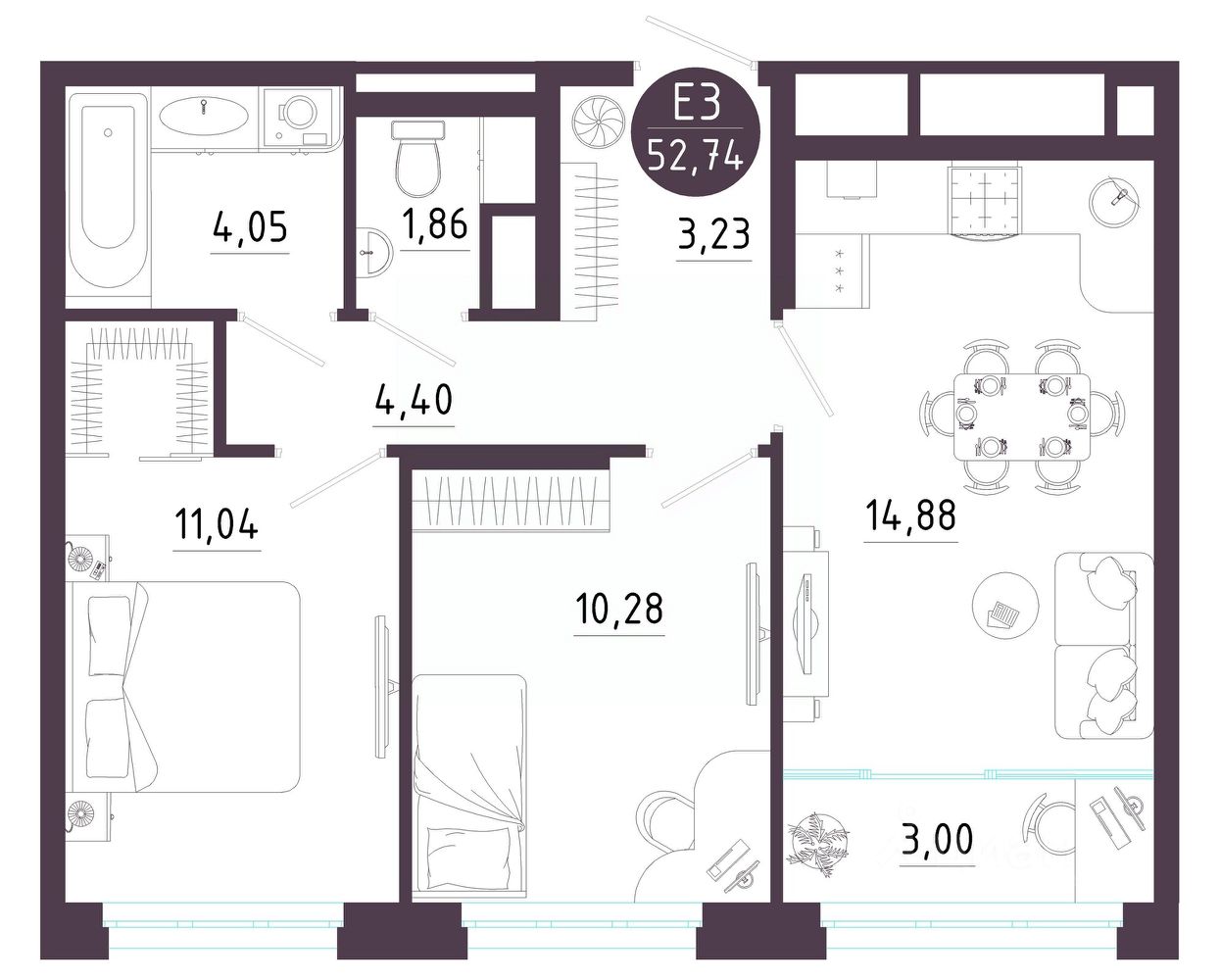 Общая площадь52,74 м2