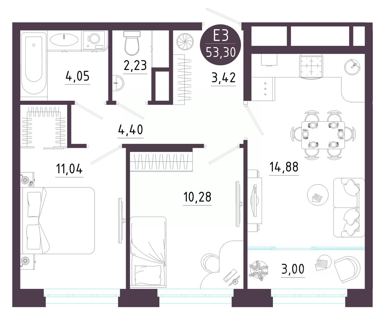 Общая площадь53,3 м2