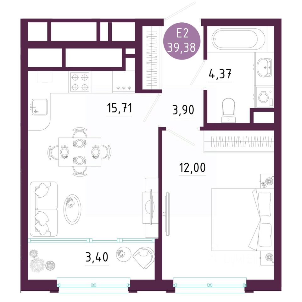 Общая площадь39,38 м2
