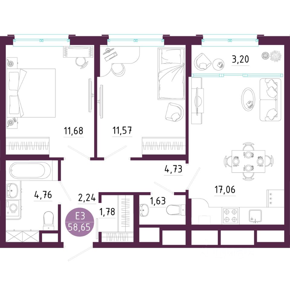 Общая площадь58,65 м2
