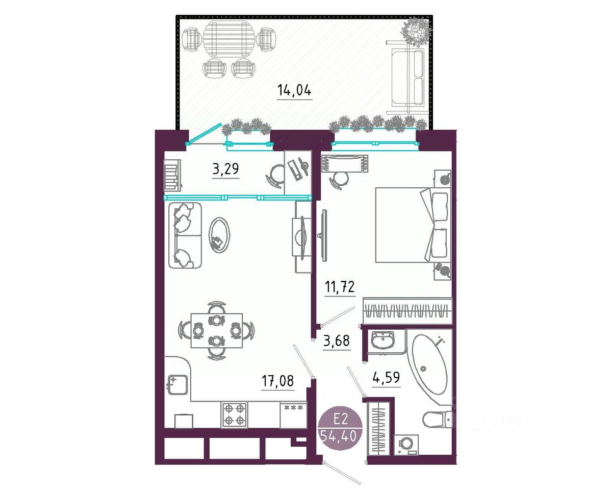 Общая площадь54,4 м2
