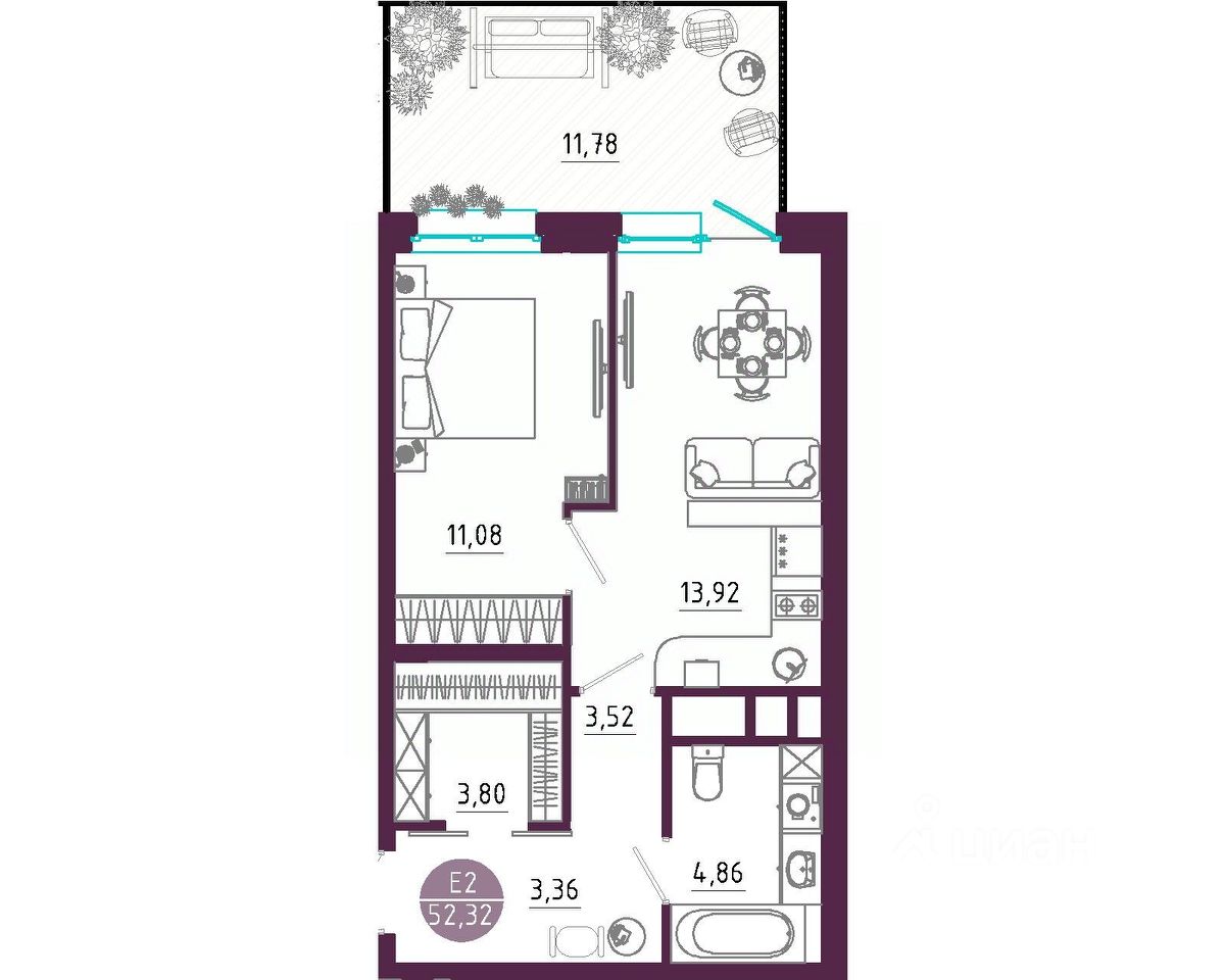 Общая площадь52,32 м2