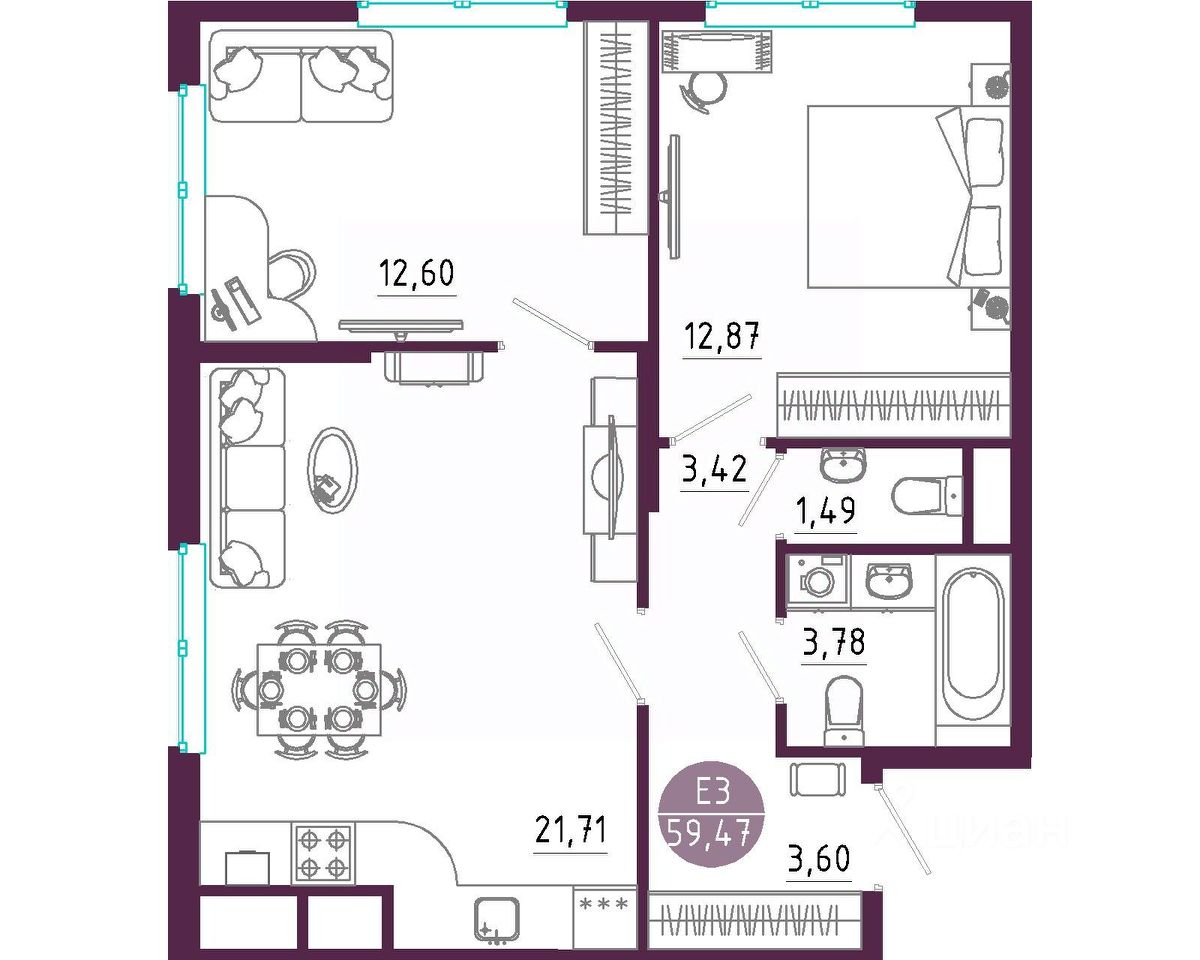 Общая площадь59,47 м2