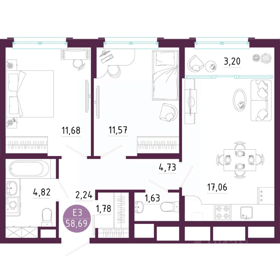 Общая площадь58,71 м2