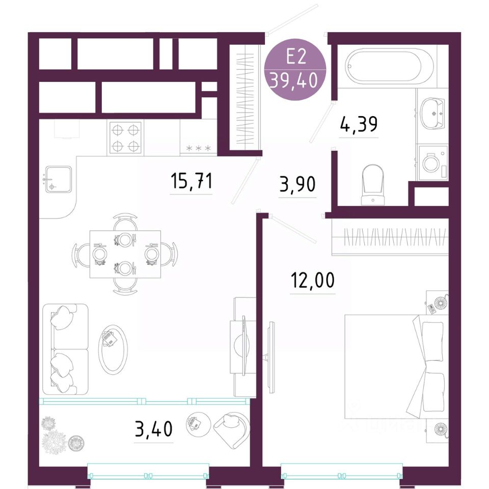 Общая площадь39,4 м2