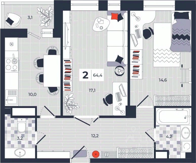 Продаётся 2-комнатная квартира в строящемся доме (Дом 30), срок сдачи: IV-кв. 2026, общей площадью 64.4 кв.м., на 5 этаже. Расположение, транспортная доступность Новый жилой комплекс ''Юго-Восточный'' строится в Туле, в 3,5 км от центра города. Благодаря удачным транспортным развязкам, автолюбители смогут доехать до центральных кварталов примерно за 5 10 минут, составив наиболее быстрый и удобный маршрут с учетом загруженности дорог. Проблем с мобильностью не возникнет и у пассажиров общественного транспорта. Рядом с домом расположены остановки автобусов и маршрутных такси, которые быстро довезут до любого района города. Так, чтобы добраться до центра, следует дойти пешком до остановки ''Медтехника'', где останавливается маршрутное такси, доезжающее до центральных кварталов всего за 7 8 минут. Инфраструктура Район, где возводится новый жилой комплекс, активно застраивается, и сеть инфраструктуры сов временем будет расширяться. Но и сейчас все, что нужно для комфортной жизни в городе, находится недалеко от жилого комплекса. В шаговой доступности расположены продуктовые магазины: ''Виктория'', ''Овощи-фрукты'', Магазин рыбы и мяса птицы, магазин мяса и колбас ''У Максима'', супермаркеты ''Дикси'', ''Пятерочка'', ''SPAR''. Неподалеку находится гипермаркет ''Линия'', крупный торговый центр, в котором расположены отделения банков, гипермаркет ''Глобус'', салон оптики, мебельный магазин ''Столплит'', зоомагазин ''Четыре лапы'' и пр. В соседнем здании находится строительный гипермаркет ''Леруа Мерлен'', за ним крупный магазин товаров для спорта, туризма и активного отдыха ''Декатлон''.Недалеко от жилого комплекса открыты кафе и рестораны: кофейня ''Bonape'', пиццерия ''Культура'', кафе ''Вкуснов'', кафе быстрого обслуживания ''Rapido'', ресторан ''У фонтана'' и пр.В районе есть аптеки, поликлиники, диагностические центры. В шаговой доступности от жилого комплекса расположено несколько детских садиков, в том числе, садик комбинированного вида ''Алые паруса''. Есть дошкольные отделения, входящие в состав образовательных центров, Центры развития ребенка. Поблизости расположены средние школы, в том числе, школа для детей с ОВЗ. Рядом с жилым комплексом находится Тульская Духовная Семинария и Суворовское училище. Надежность застройщик: достраивает объект ООО Ин-Групп.АрхитектураЖилой комплекс будет представлен 19 монолитно-кирпичными корпусами переменной этажности, выполненными в едином архитектурном стиле. При строительстве ЖК ''Юго-Восточный'' применяются современные материалы высокого качества, которые обеспечивают надежность домов и комфортный микроклимат в помещениях. Каждая секция оснащается современными лифтами. Помещения общего пользования отделываются экологичными материалами. Квартиры предлагаются однокомнатные (от 43,9 кв. м), двухкомнатные (от 45,8 кв. м), трехкомнатные (от 60,4 кв. м) и четырехкомнатные (от 87,2 кв. м), а также уютные студии (от 28,9 кв. м).На внутренней территории проводится комплексное благоустройство: озеленение, организация игровых площадок, мест для отдыха и зан