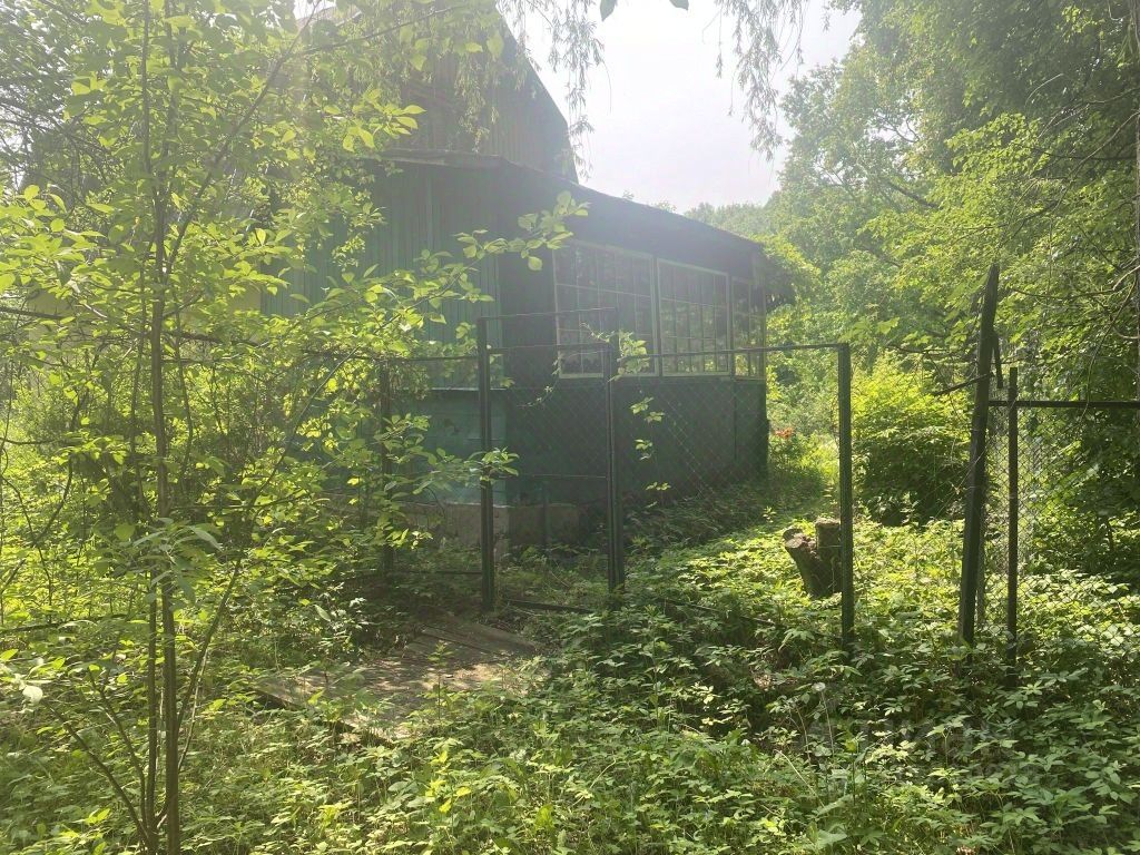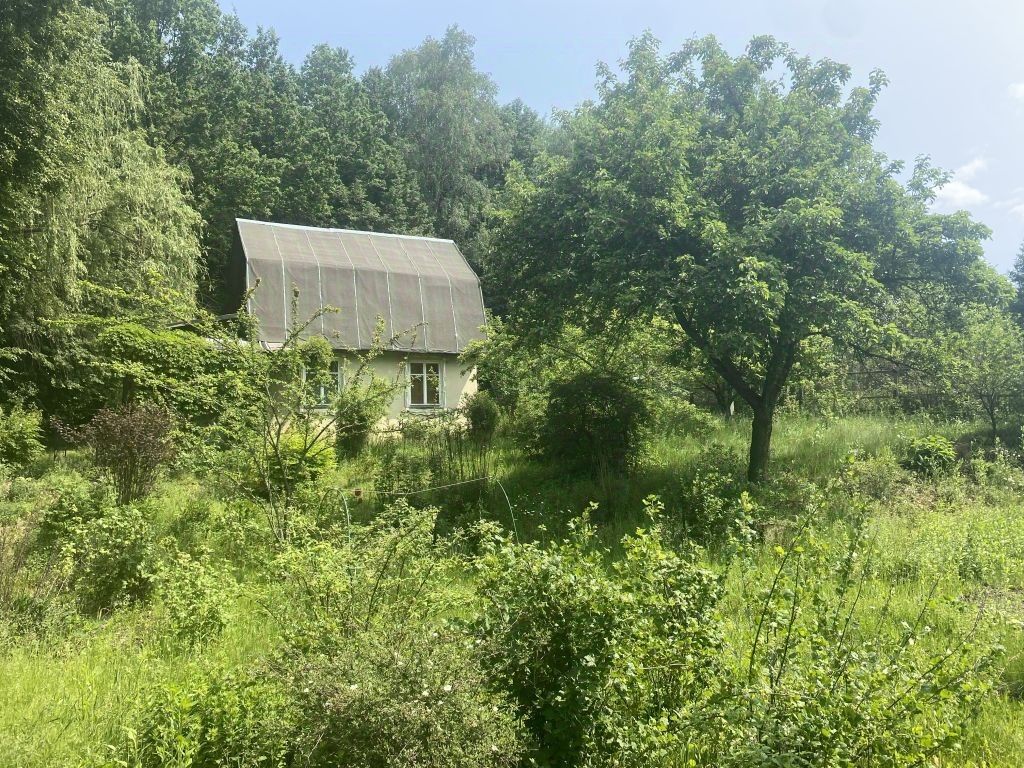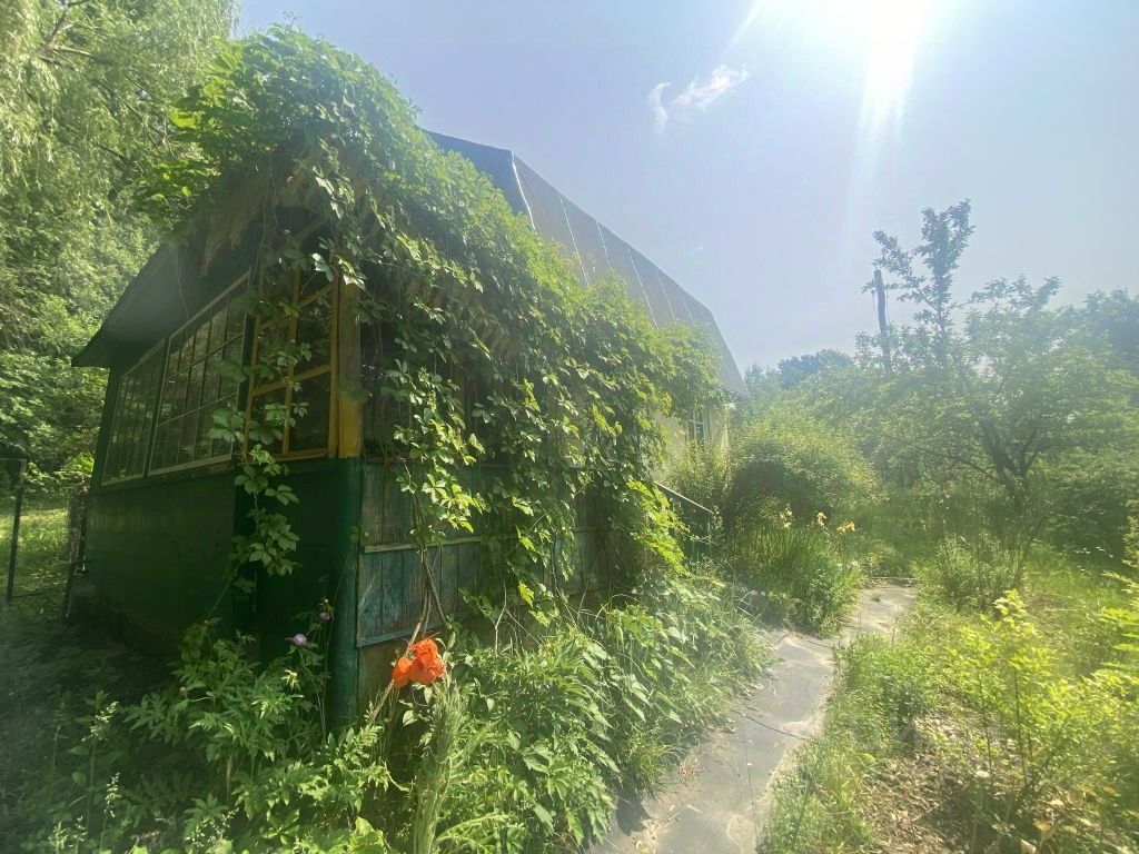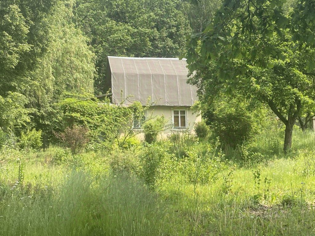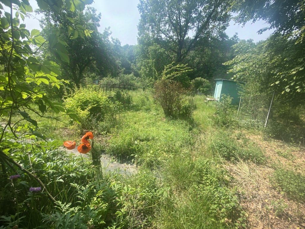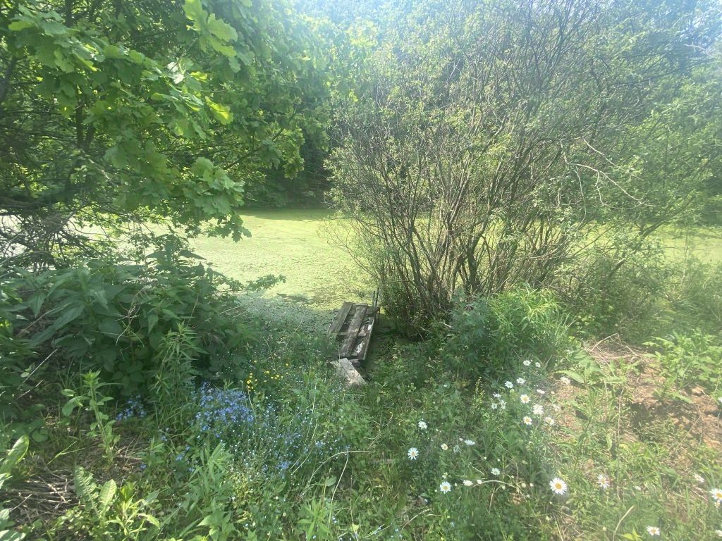 За участком расположен пруд. На участке растут яблони, смородина, крыжовник и малина.