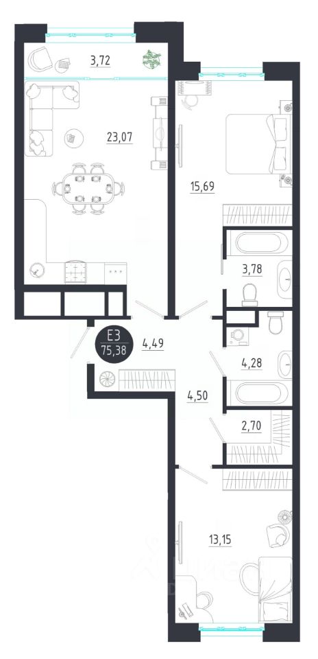 Общая площадь75,38 м2