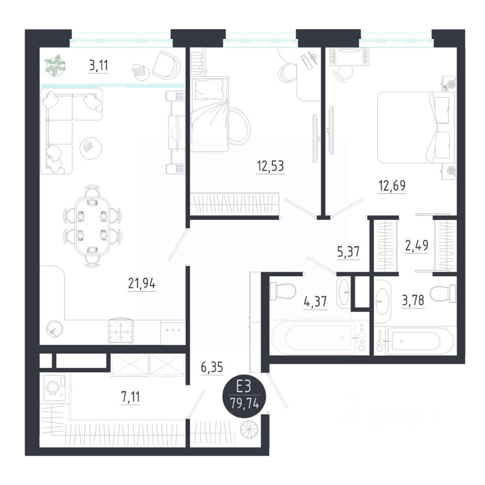 Общая площадь79,74 м2