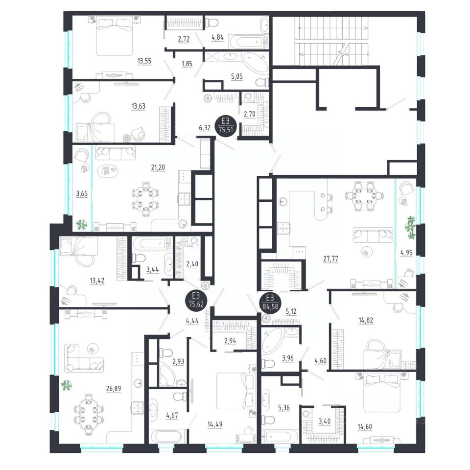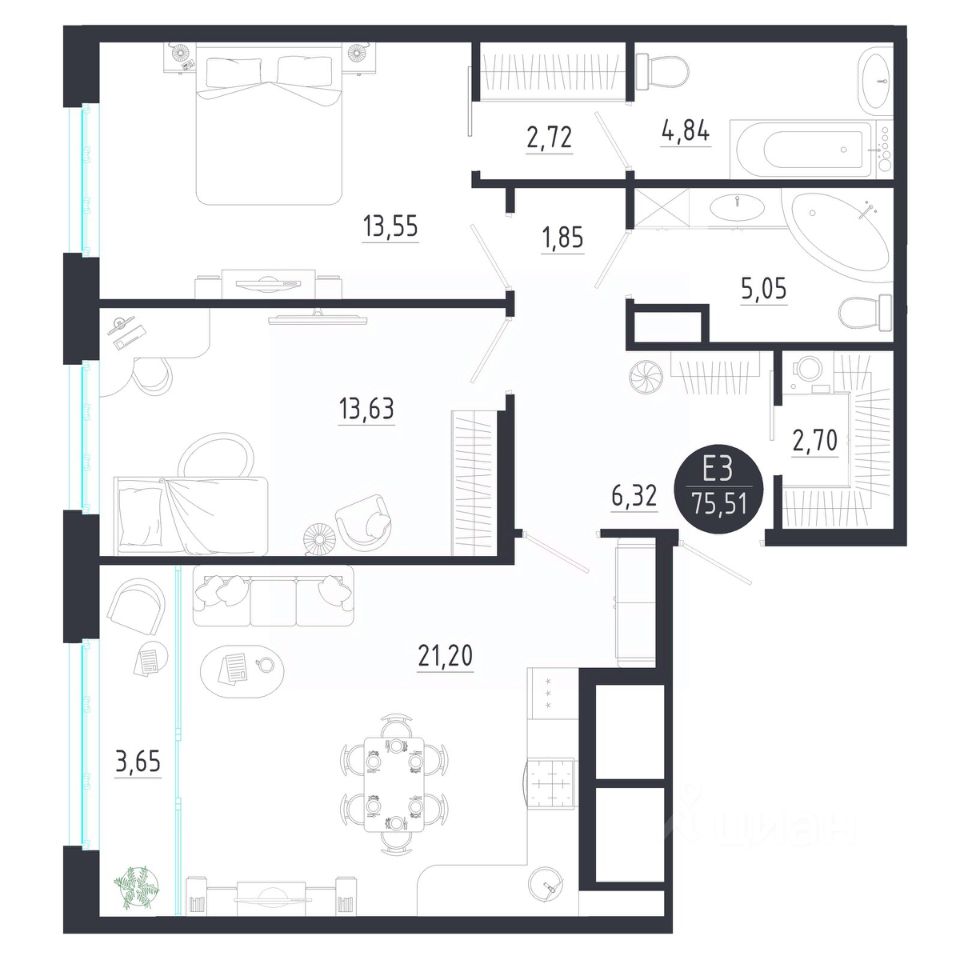 Общая площадь75,51 м2
