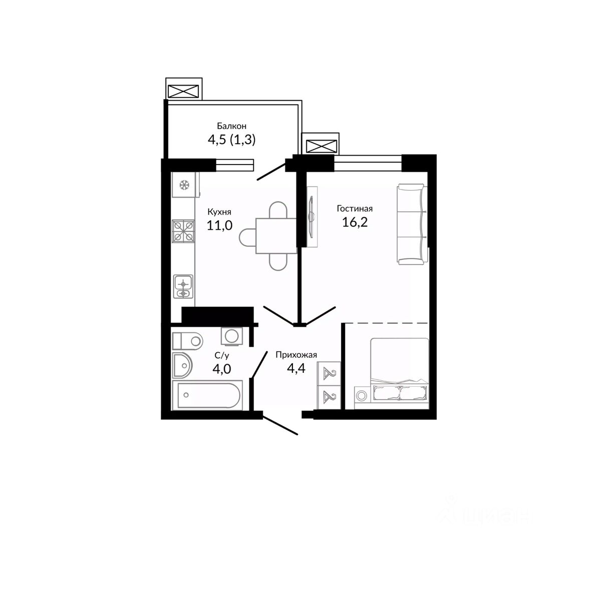 Общая площадь38,5 м2