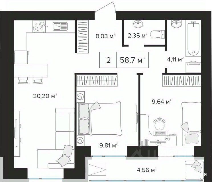 Общая площадь58,7 м2