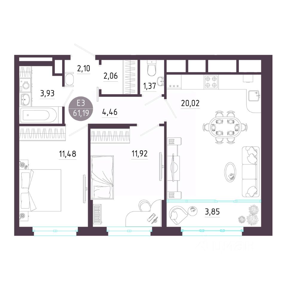 Общая площадь61,19 м2
