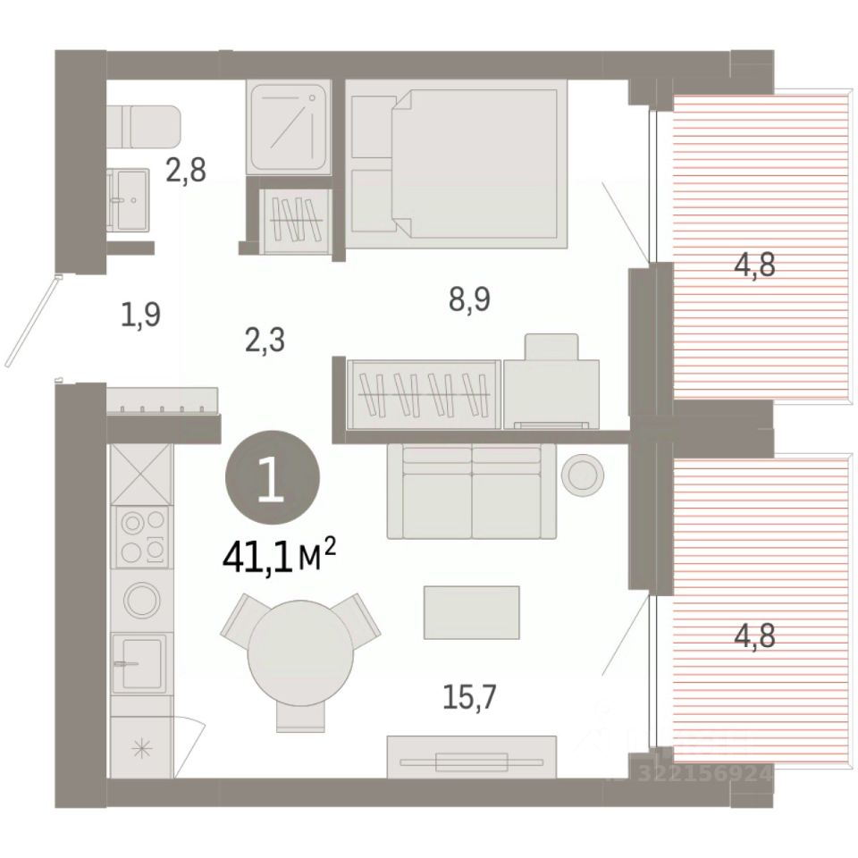 Квартира с кухней-гостиной и одной спальней в жилом районе ''Пшеница''. Особенности планировки: балкон, предчистовая отделка. квартиры в нашей базе: ПШЦ06.1-Ж4.6.3.