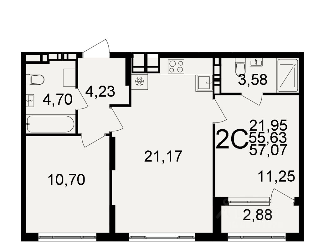Общая площадь57,07 м2