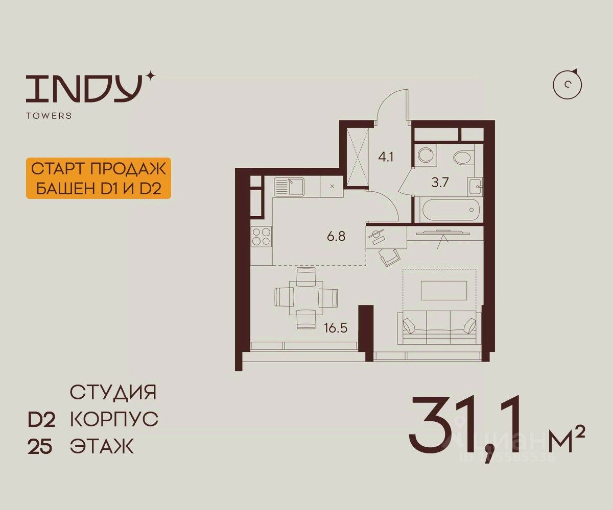Продажа от застройщика. Продается просторная студия на 25 этаже жилого комплекса Indy Towers. Срок сдачи: 3 кв. 2029 г.