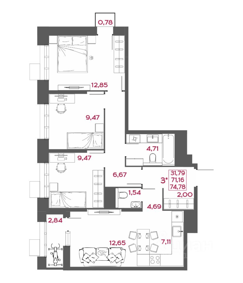 Общая площадь74,78 м2