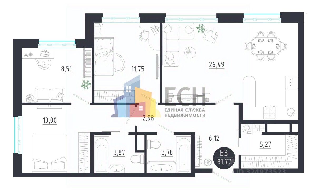 Номер в базе: 56302. В продаже уникальная семейная планировка, состоящая из 3х изолированных комнат, и просторной светлой кухней - гостиной площадь 27м2. 2 санузла. Лоджия. Вид на город.