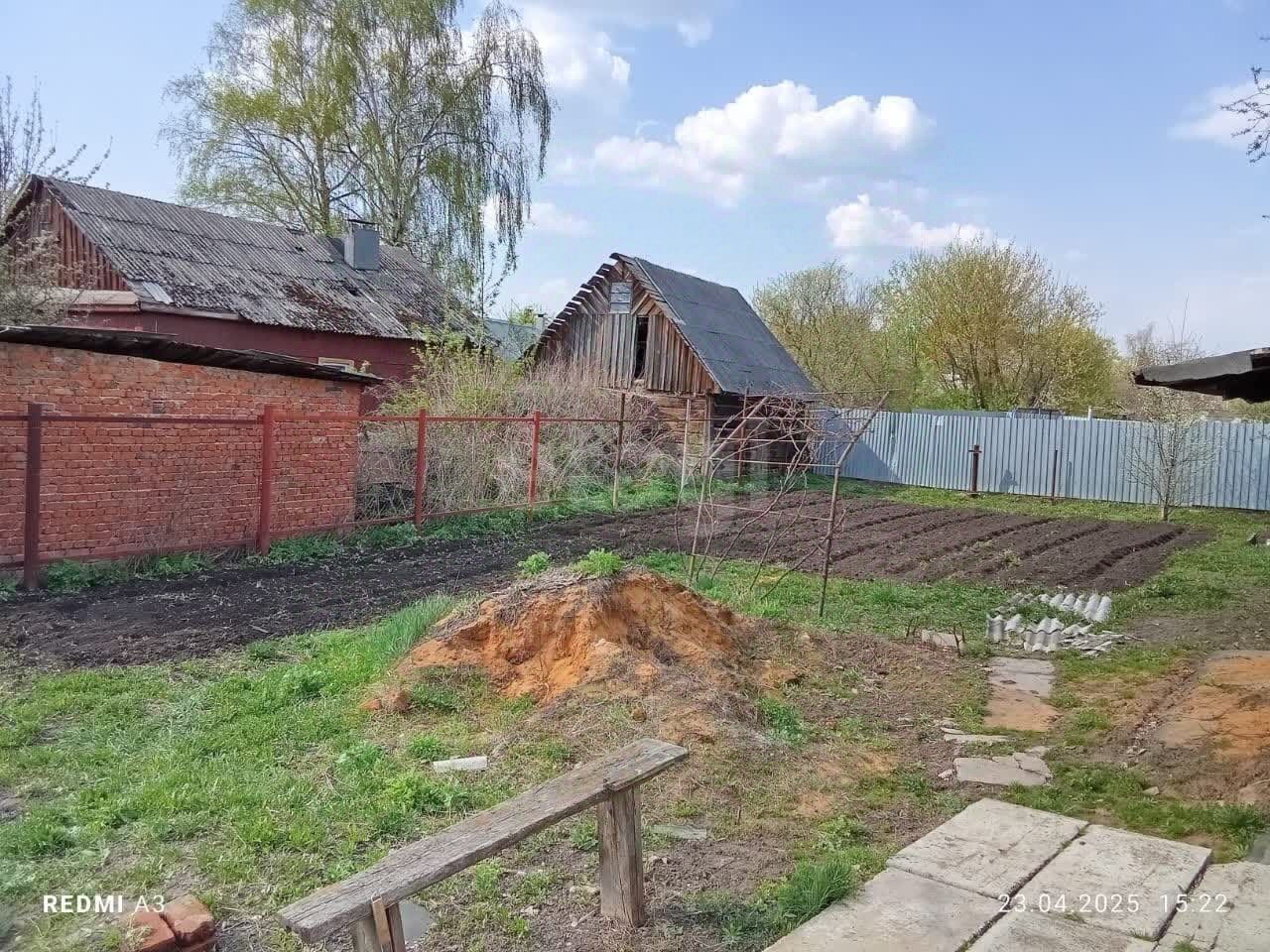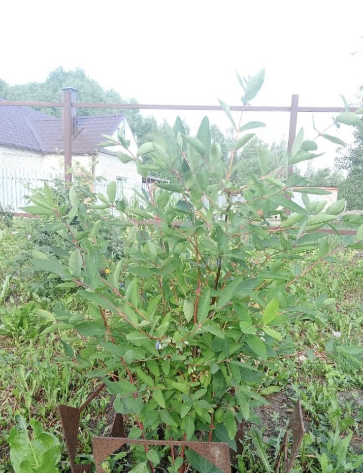 На участке растут вишни, сливы, яблоня, жимолость, черная смородина, малина, цветы.