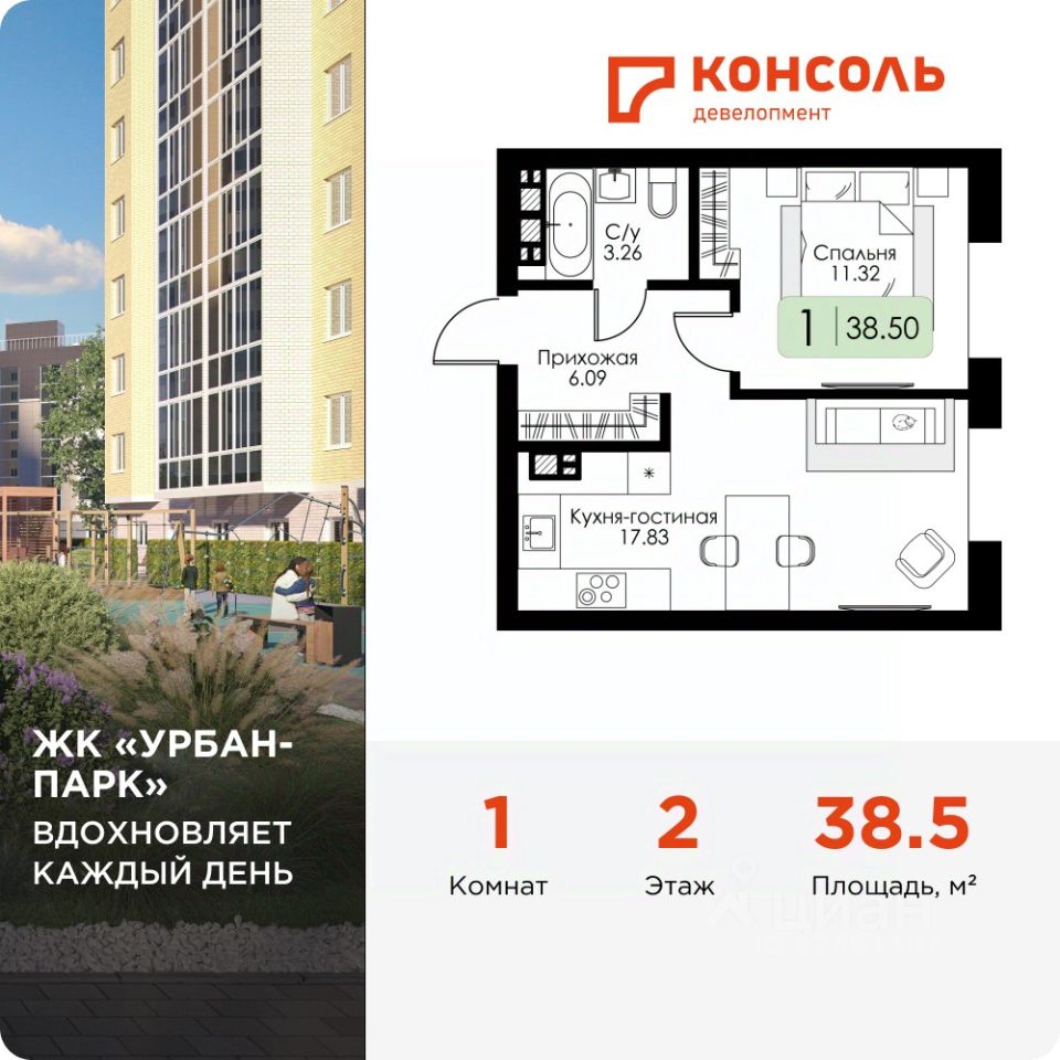 Продается однокомнатная квартира 2 без отделки в ЖК ''Урбан Парк'' площадью 38.5 на 2 этаже от застройщика Консоль девелопмент.