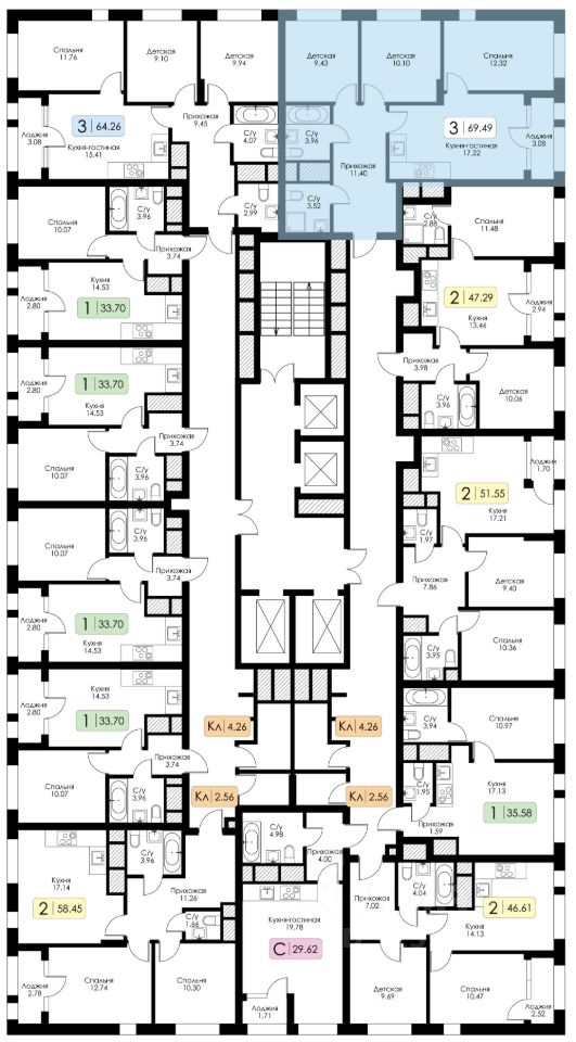 Площадь 69.49 на 23 этаже.