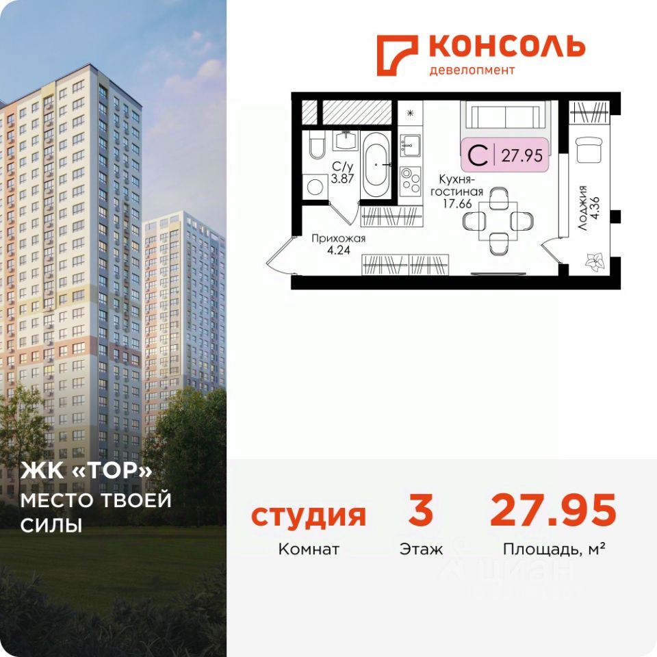 Продается квартира-студия 13 без отделки в ЖК ''ТОР'' площадью 27.95 на 3 этаже от застройщика Консоль девелопмент.