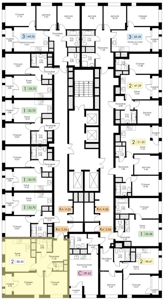 Площадь 58.45 на 12 этаже.