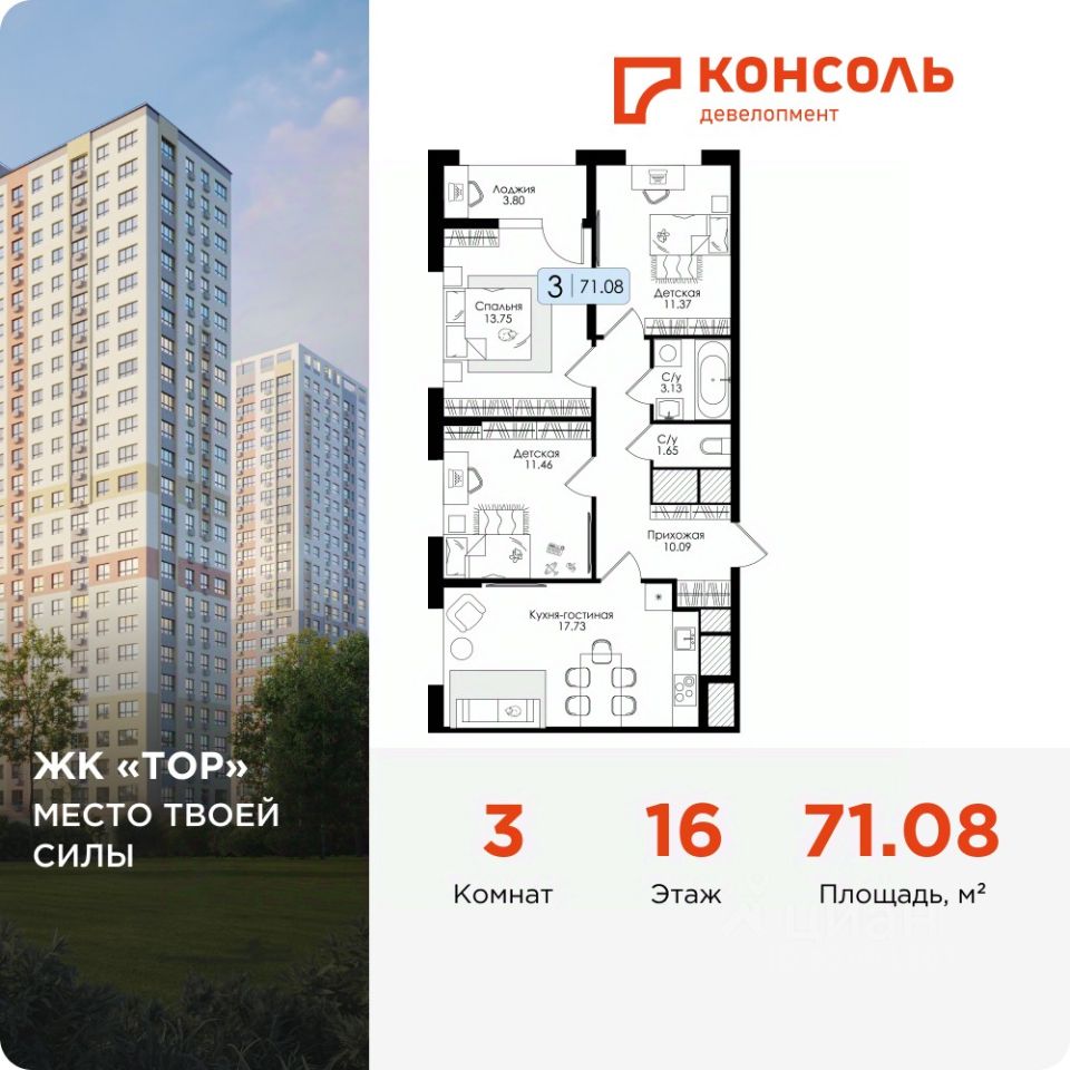 Продается трехкомнатная квартира 177 без отделки в ЖК ''ТОР'' площадью 71.08 на 16 этаже от застройщика Консоль девелопмент.