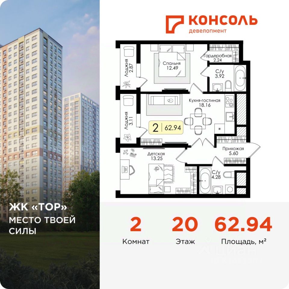 Продается двухкомнатная квартира 188 без отделки в ЖК ''ТОР'' площадью 62.94 на 20 этаже от застройщика Консоль девелопмент.